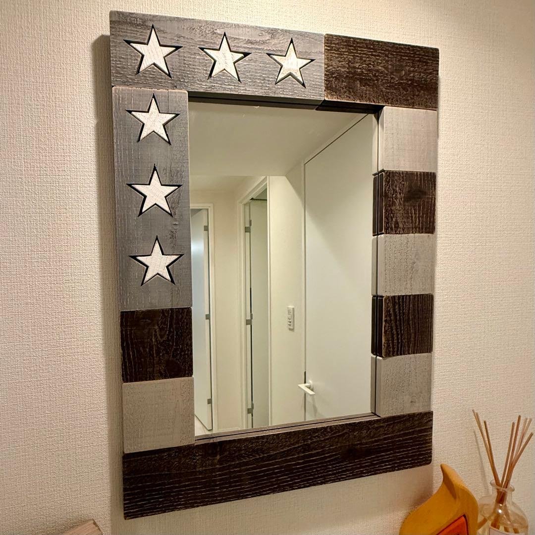 ヴィンテージ風 フラワーモチーフ 木製フレーム 3連ウォールミラー45年ほど前にハワイのフリーマーケットにて購入し使用していた木製フレーム ウォールミラーです。天然杢を使用したフレーム、ミラーにはおしゃれなフラワーモチーフが施されいて、高級感があります。ショップやレストランのインテリアとしてもお使いいただける逸品です。飾りやすさと、補強の為に背板と金具を取り付けたので安心してお使い頂けます。※サイズ約940㎜x550㎜ 厚み25㎜(背板含む)※ミラーに小傷(シミ)がありますので写真にてご確認お願いします。※完璧を求める方や神経質な方はご遠慮ください。※お取引後の返品、クレームはお断りします。ご覧いただきありがとうございます。